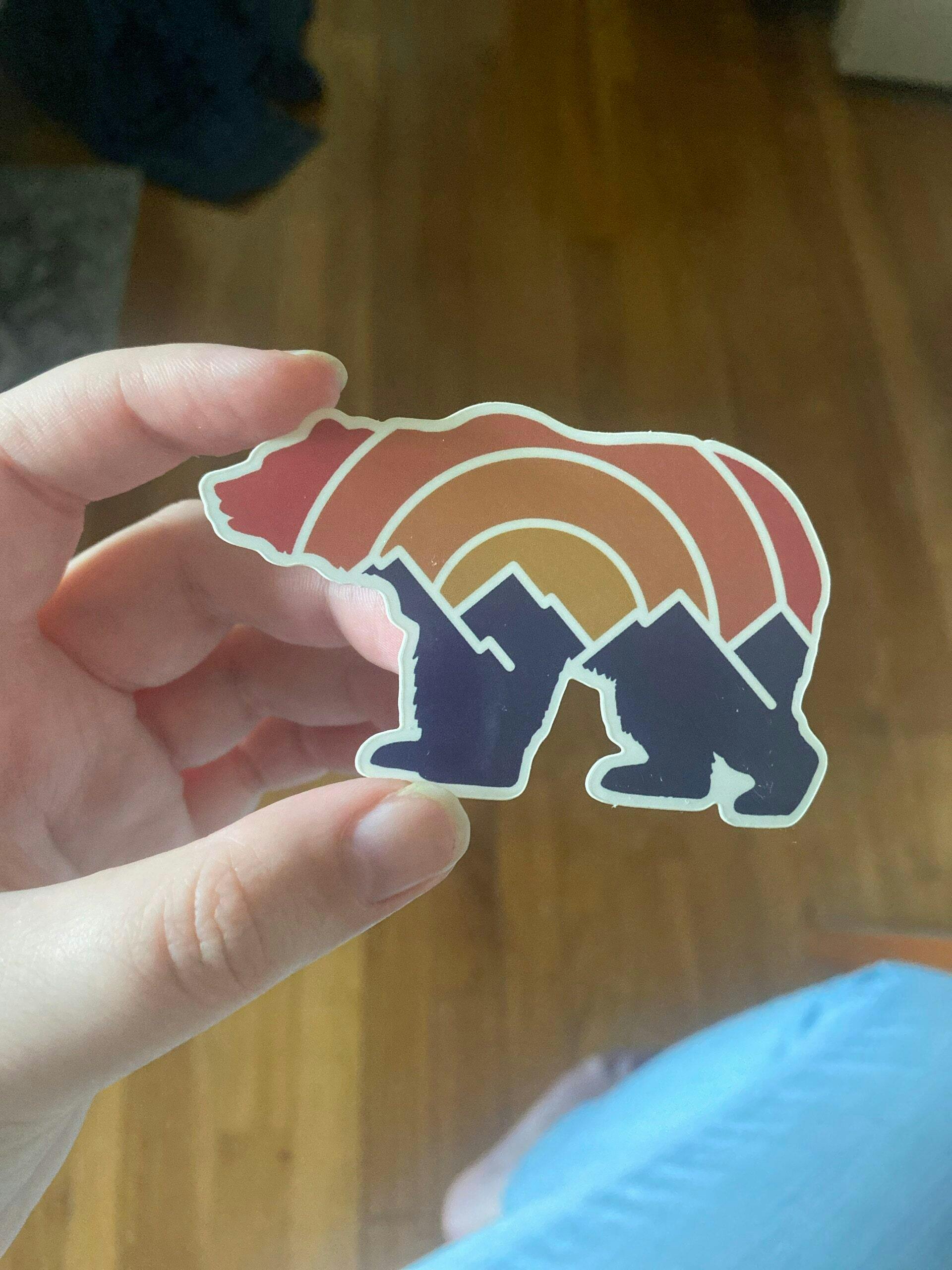 Meet the bear that’s equal parts wilderness and wanderlust. Our Adventure Grizzly Bear sticker layers bold mountain peaks and retro sunset vibes inside the silhouette of a grizzly — the ultimate mash-up of wild strength and laid-back adventure. Printed on durable, weatherproof vinyl, this sticker is built to tag along on water bottles, coolers, laptops, or bumpers without losing its cool. It’s the perfect reminder that adventure isn’t just out there — sometimes it’s riding shotgun with a bear.